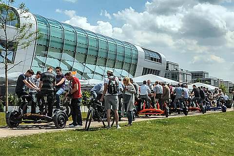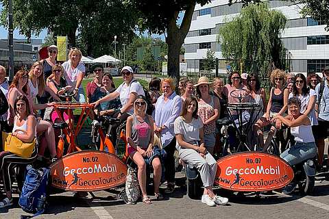 Ein Erlebnis der besonderen Art bietet das GeccoMobil - unser Gruppenfahrrad für bis zu 7 Personen im Kreis sitzend. Einer lenkt, die anderen müssen ihm vertrauen. Dazu kommt die Sitzhaltung quer oder gar rückwärts zur Fahrtrichtung: Was im ersten Moment ungewohnt ist, wird nach kurzer Zeit eine echte Gaudi.